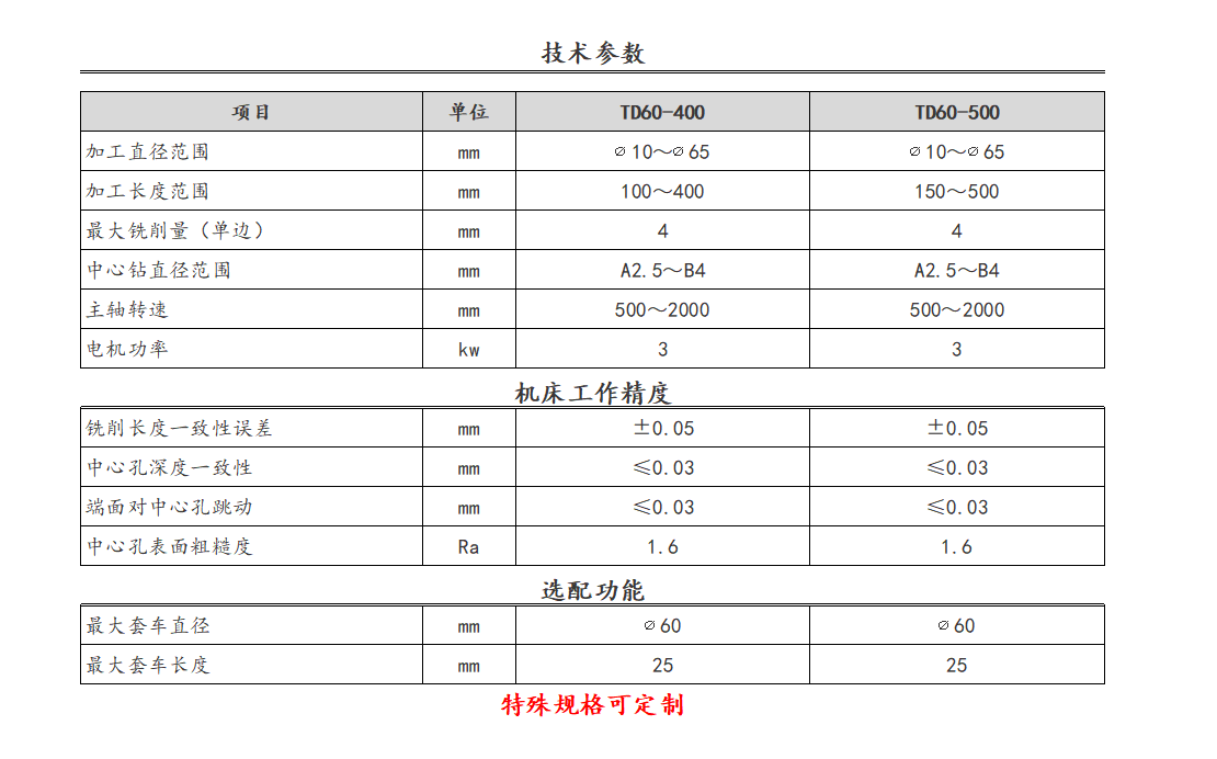 TD60臥式平床身銑端面打中心孔機床/銑打機,本系列機床以經(jīng)濟實用節(jié)省占地空間為主,針對直徑?60mm及以下,長度500mm以內(nèi)的中小型軸類零件加工而設(shè)計,該系列機床采用對置的銑,鉆復(fù)合單主軸動力頭,可滿足銑端面,鉆中心孔以及套車外圓及倒角加工,具有加工效率高、性能穩(wěn)定、經(jīng)濟性強、實用性靈活、操作方便等特點。